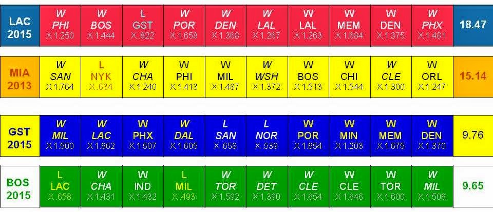 San Antonio's hotness over its last 10 games of the 2014-15 season is 28.47, obtained by multiplying the automatic start value of 1.00 x 1.685 (for the win over Memphis) x 1.466 (for the win over Miami), and so forth. The season-ending loss to New Orleans (which entered the game with a .543 winning percentage) essentially halved the Spurs' hotness value (i.e., multiplying by .543) in one fell swoop.